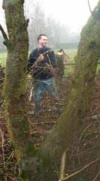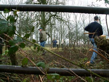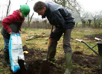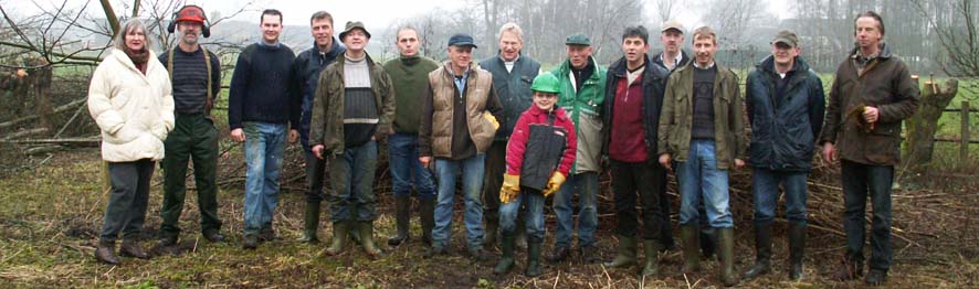De dag begon om 9.30u met het knotten van de elzen rondom de boomgaard en de aanplant van de nieuwe fruitbomen. De fruitbomen werden geplant in een plantgat van 0.75.x0.75m, die eerst werden gevuld met schoon zwart zand, vermengd met potgrond. De gesnoeide afvaltakken zijn op “rillen” gelegd, wat weer gunstig is voor de fauna in het gebied. De familie Nieuwland, zelf ook de hele dag actief meegewerkt, heeft onze leden zeer gastvrij onthaald.