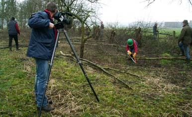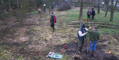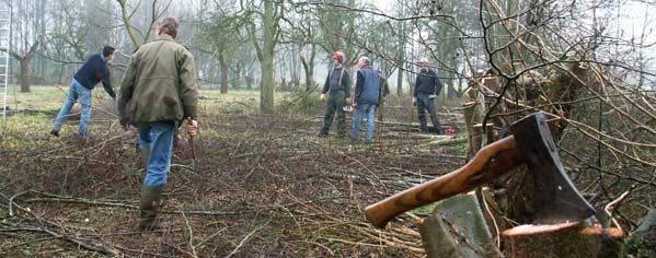 Een gedeelte van de elzen, uit de singel, werd geknot en een aantal nieuwe fruitbomen in de boomgaard aangeplant.
