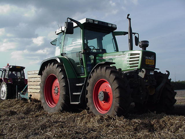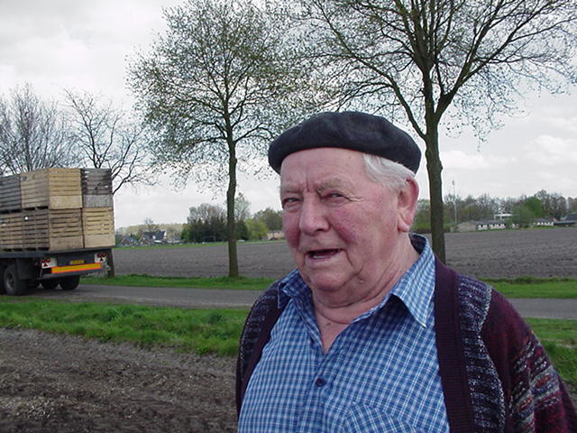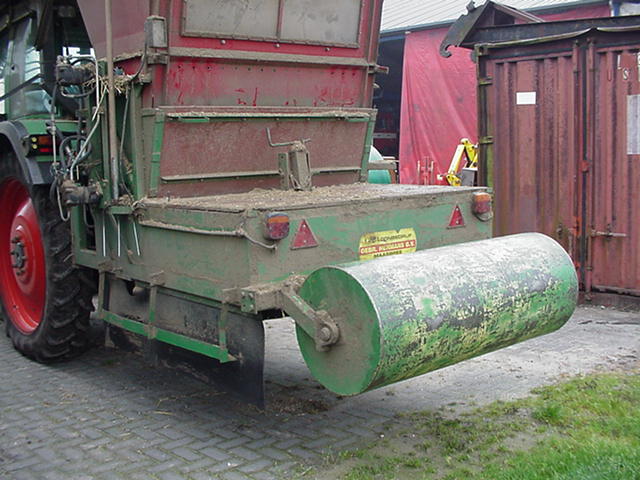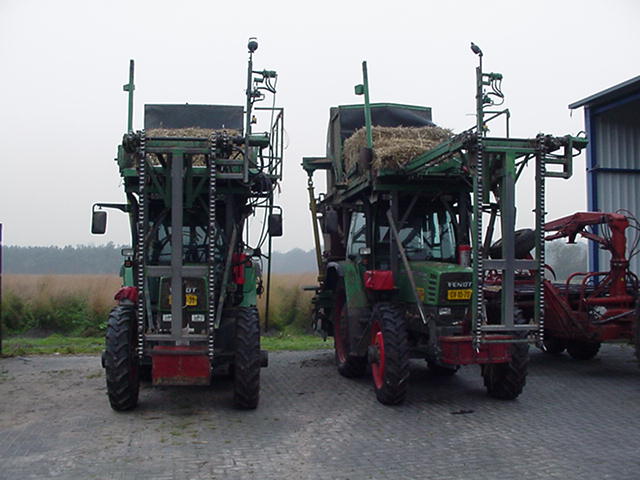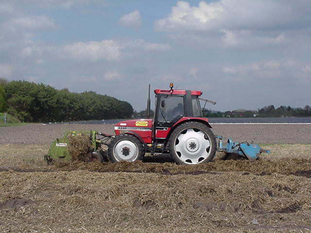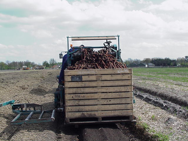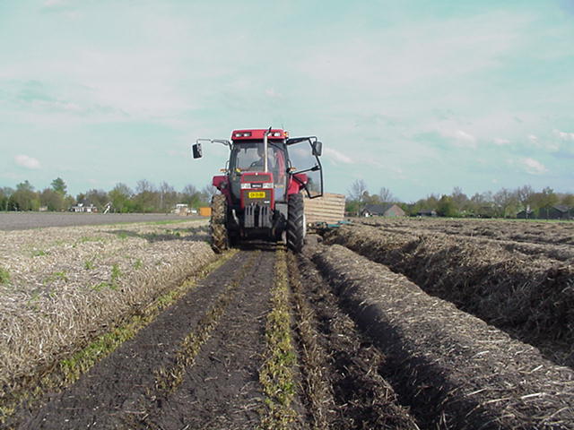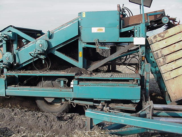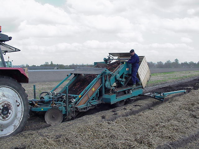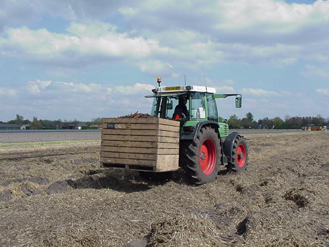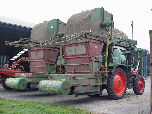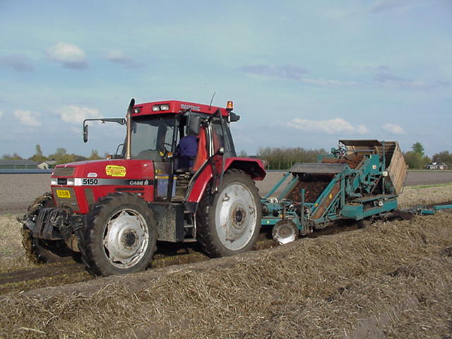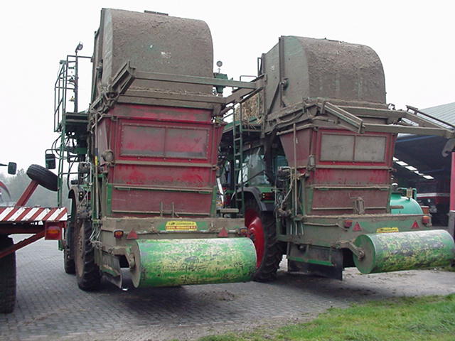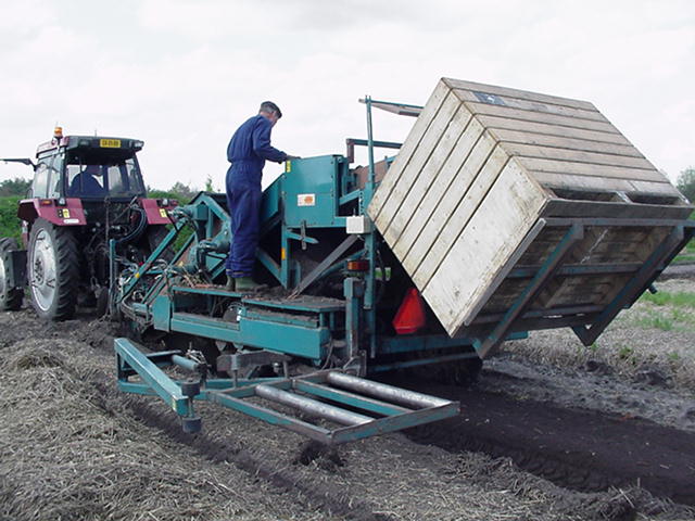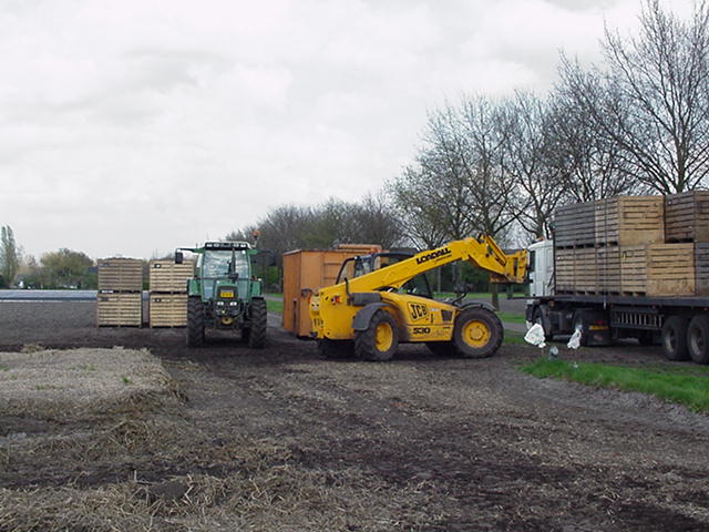 Vervolgens worden ze uit de grond gelicht met een wortelrooier (achter de tractor) en middels een trilband zuiver geschud. Daarna worden ze opgevangen in een palletkist, die tijdens het rijden verwisseld kan worden.