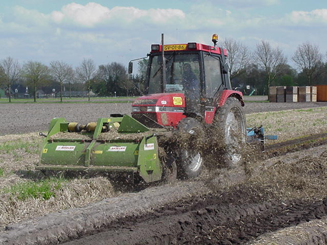 De wortels worden m.b.v. een klepelaar en veegmachine eerst ontdaan van het strobed en het wortelloof.